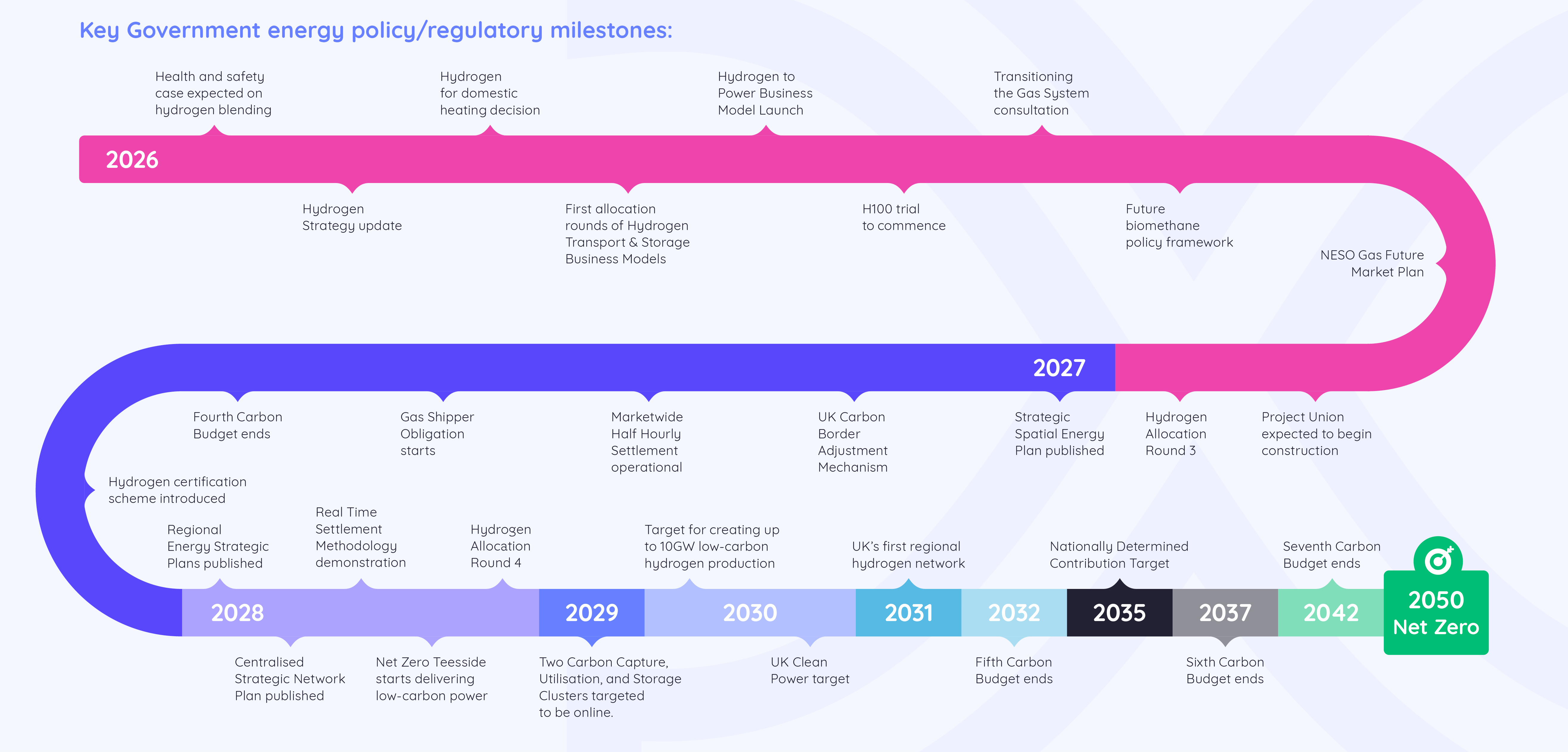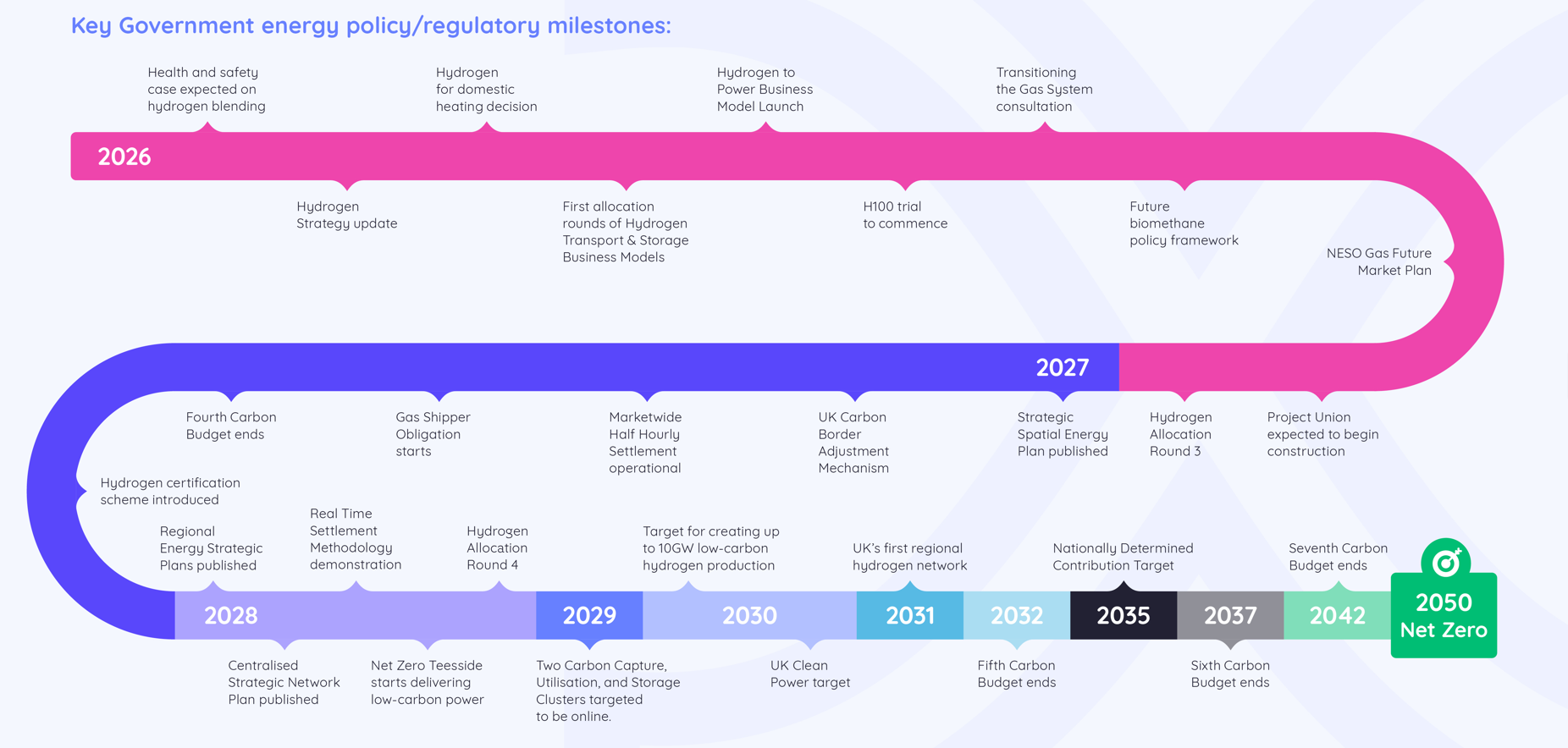 Policy updates timelineKey Government energy policy/regulatory milestones from 2026 until the net zero deadline of 2050.
