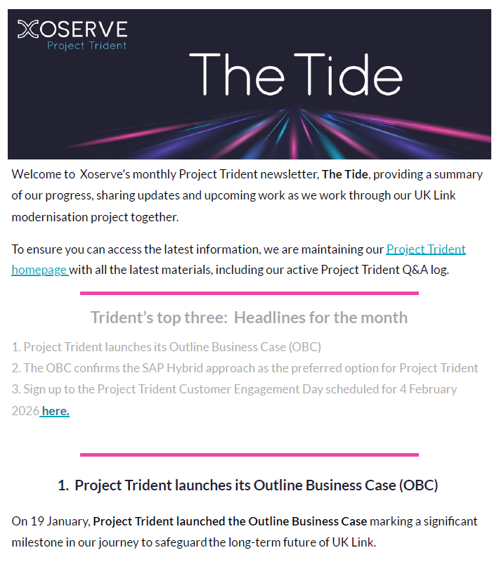 The Tide - Issue 15 January 2026Welcome to #15 of The Tide, Xoserve’s monthly newsletter, providing a summary of our progress, sharing updates and upcoming work as we navigate the waters of our UK Link modernisation project together.